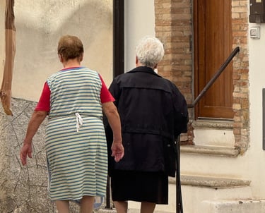 One of the clearest expressions of this is the evening giro. Especially in warmer months, residents take a slow, unhurried walk through the village streets, often looping the same paths more than once. Walking in giro is a long-standing Italian tradition, but in Grottole it feels habitual rather than ceremonial. People walk in pairs or small groups, stop to exchange news, notice who is out, and return home without any clear beginning or end. It’s part of the daily rhythm, not an event.